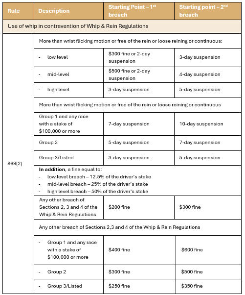 An example of the increase in penalties is provided with the whip and rein regulations below which show the increased starting points for Group and Listed races.